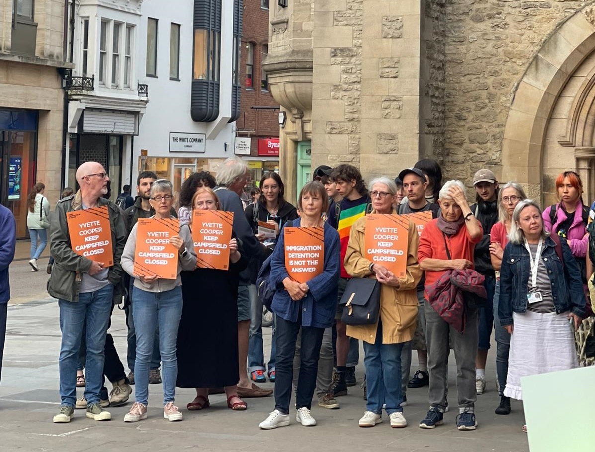 The Coalition issued a news release and announced an immediate protest at Carfax in Oxford on the evening of the announcement. This was attended by around 50 people, including Calum Miller, the MP for Bicester and Woodstock (where Campsfield is located), Green Party councillors, trade union representatives, and local residents.