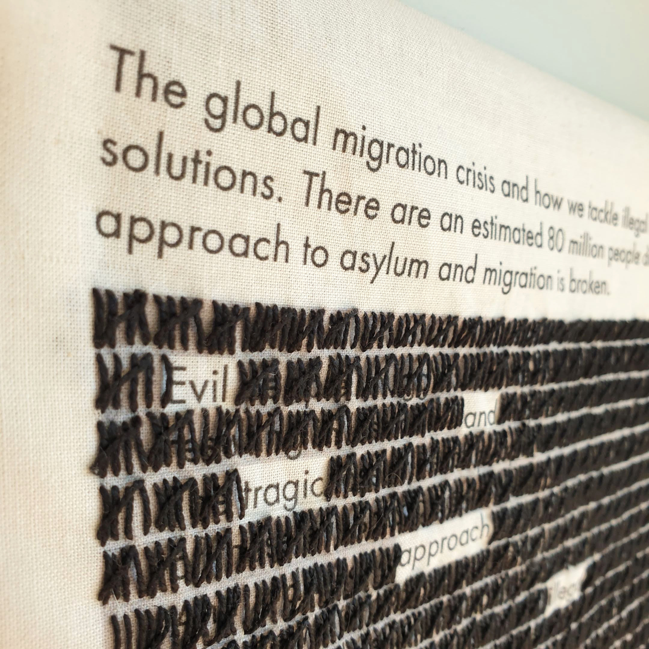 What they don’t do is describe how, in the week of that AGM and parliamentary debate, a hundred new Afghans arrived in Oxfordshire, many at just hours’ notice. Asylum Welcome is supporting them in two local hotels while they begin the long wait for permanent housing. It is positive that the government’s resettlement programme is still alive for some of those people at high risk who manage to travel from Afghanistan to neighbouring countries. It’s much uglier for those others, often in similar need, who don’t get on these programmes and make their own way overland to try and get to the UK. They are the ones likely to be deported to Rwanda or detained in Campsfield if it is reopened. It is that injustice that inspires Corinne’s powerful and beautiful artwork you can read about below.