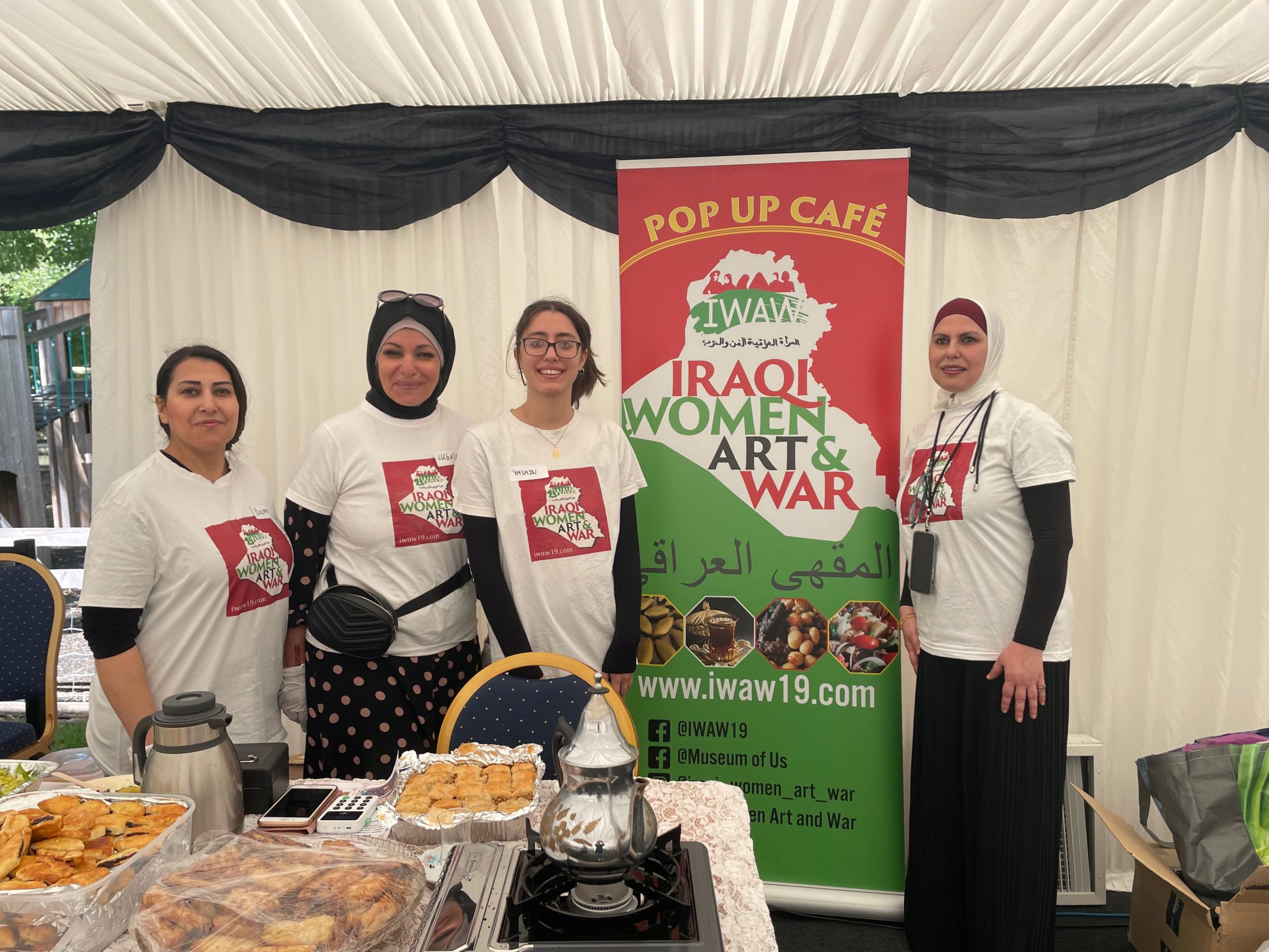 Iraqi Women Art and War (IWAW), formed by Iraqi artist Rana Ibrahim, showcased multi-textual art, which is produced by members as a mode of creatively expressing their experiences of warfare and forced migration. Running arts and crafts activities for children, encouraging visitors to dance to Iraqi tunes, giving intricate henna tattoos, and plating up irresistible food such as dolmeh (stuffed vine leaves), tabola salad, kobba, kleicha, and baklawa, the IWAW team promoted their creative expression joyfully and interactively.