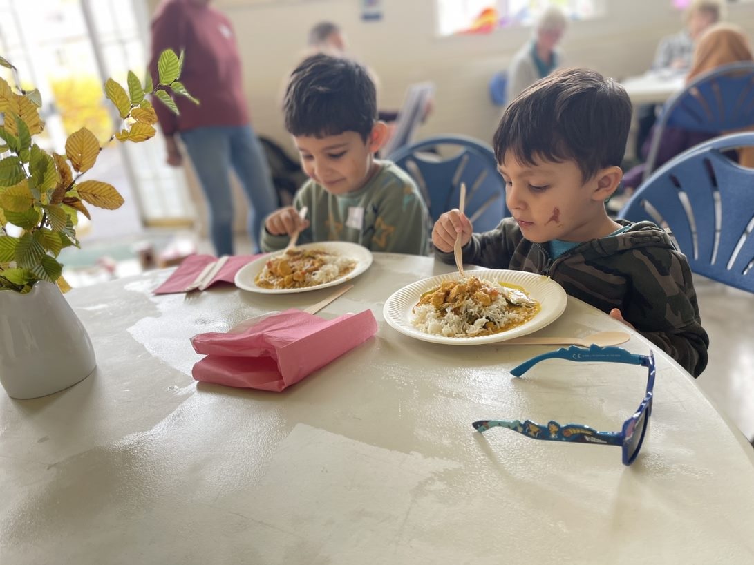 The Old School Hall. Bright balloons on the wall, circular tables laid out with colourful paper and paints, scissors and glitter tubes, coloured tissue paper flowers, wooden train track on the floor, face painting in one corner, music making on an electric keyboard in another and outside, autumn sunshine. Families begin to arrive and gradually 20 or so bright-eyed chattering children (aged from a few months to 13 years) spill into the hall. Some early arrivals are already exploring what they can do. This was the scene at the start of an Asylum Welcome Family Day. These days aim to support displaced families as they come to terms with the change in their lives. The children let off steam and have fun, maybe they make new friends while the adults have an English class in another room and also maybe make friends. And at midday, WOW again, everyone comes together and sits down to a delicious hot Middle Eastern lunch – families, volunteers, and AW staff – all followed by a spirited concert of close harmony singing given by students at Oxford University.